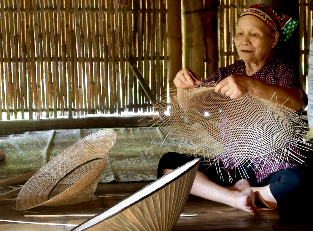 Nhà cụ Ma Thị Phú, xóm Sơn Vinh, xã Sơn Phú (Định Hóa), hôm nay râm ran tiếng nói cười. Giữa nhà, ô bếp vuông rực than hồng, vùi mấy tấm cơm lam tỏa mùi nếp nương thơm lựng, khói bốc lên bọc chục chiếc vành nón tròn xoe treo lủng lẳng trên gác bếp. Đã 92 tuổi nhưng cụ Phú xâu kim chưa phải đeo kính. Bên ô cửa nhà sàn nhìn ra đường làng, cụ ngồi làm công việc quen thuộc từ thời con gái: Đan nón Tày.