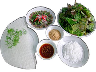 Gỏi cá ăn kèm các loại rau thơm húng, ngò, răm … nhưng không thể thiếu đinh lăng, lá sung, mơ tam thể … Bày tất cả lên nâm, đĩa cá gỏi màu trắng ngà lấm tấm sắc vàng của thính, đĩa rau sống tổng hợp màu xanh lục, bát nước chấm thơm ngào ngạt và đặc sánh, thêm đĩa gia vị gồm ớt, khế, chuối xanh thái thành lát mỏng, vài chiếc bánh đa cùng một chén rượu nữa là bữa gỏi cá đã hoàn thành.