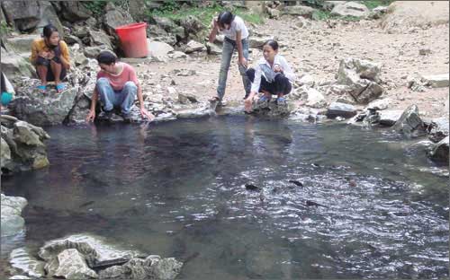 Suối cá thần - điểm du lịch nổi tiếng xứ Thanh thuộc bản Ngọc (làng Ngọc), xã Cẩm Lương, huyện Cẩm Thủy.
