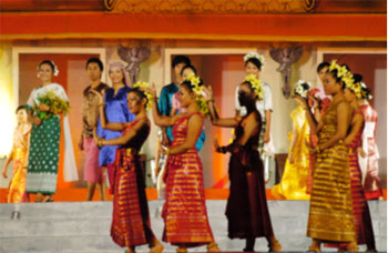 Vào mỗi dịp lễ tết, lên chùa lễ Phật, họ mặc xà-rông có đính chuỗi hạt cườm ở cạp. Áo tầm-vông dệt bằng tơ tằm, sợi bông, hay chỉ kim tuyến với các loại hoa văn khác nhau màu trắng họăc vàng chủ đạo. Để tôn thêm nét dịu dàng uyển chuyển đầy nữ tính trong bộ lễ phục này không thể thiếu “Sbay” - một loại khăn lụa xanh mềm mại, cuốn chéo từ vai trái xuống bên sườn phải.