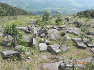 Hầm mộ đá với cấu trúc và quy mô lớn có vòm che và có nhiều khả năng theo kiểu quan trong ngoài quách. Toàn bộ mộ được dựng bằng những khối đá lớn khai thác tại chỗ. Ngoài ra, một hầm mộ khác có quy mô nhỏ hơn, được dựng theo kiểu trác thạch bằng cách lợi dụng hai tảng đá tự nhiên hai bên và ở trên đậy bằng một phiến đá. Trên một khu vực rộng lớn có rất nhiều tảng đá lớn nằm theo cụm hay đơn lẻ, một số tảng đá lớn có vết tích chế tác của con người. Qua kích thước và vết đục có thể nói những tảng đá này được khai thác làm nguyên liệu để xây dựng ngôi đền cổ. Các đập chắn nước phía trên ngôi đền lợi dụng địa thế của các dãy đá tự nhiên chạy ngang sườn núi có gia cố thêm bằng đá phiến.