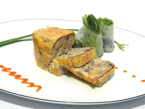 Thịt sau khi rửa sạch luộc vừa chín tới rồi cắt lát mỏng xào với hành tím và tỏi cho dậy mùi thơm. Sau đó cho thịt heo đã xào vào một cái tô lớn rồi cho trứng vịt đánh đều vào trộn chung với hành tím, tỏi cùng với tiêu hạt...