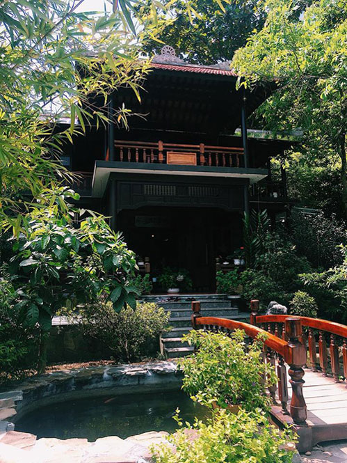 Khuôn viên xung quanh bao gồm vườn cỏ đá và ngũ hồ thơ mộng. Bạn sẽ dễ dàng bắt gặp hình ảnh một không gian xanh rì màu cỏ, mặt hồ lung linh phủ đầy hoa súng đủ màu, những con đường nhỏ hai bên nở đầy hoa, các vọng gác nơi có thể phóng tầm mắt xa xa trập trùng núi non hùng vĩ... Trên cao là mây trắng trời xanh, dưới đất thơm thoang thoảng hương hoa, sóc chuyền cành, chó mèo thong thả dạo chơi, ngỗng vịt thong dong bên hồ... thật hiếm có không gian nào làm người ta thực sự bình yên đến vậy.