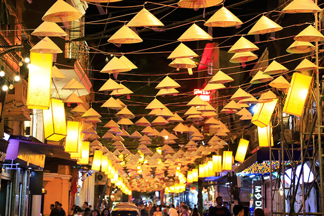 Phố Đào Duy Từ trở nên lung linh hơn, bởi hàng nghìn chiếc nón lá và đèn lồng được thắp sáng.