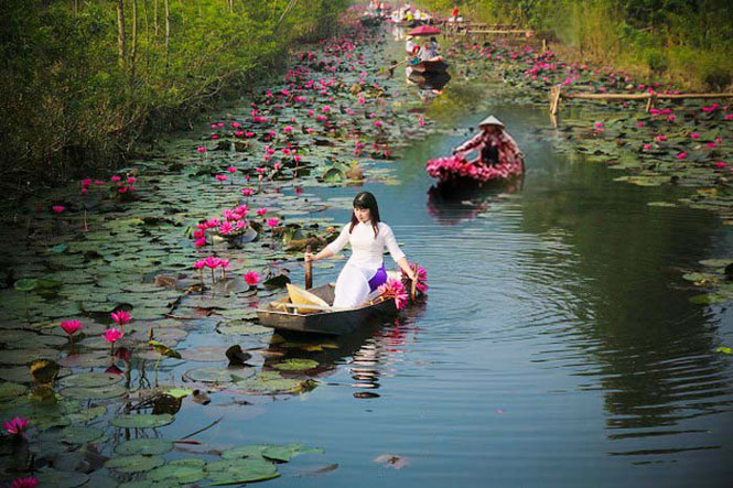 Từ bến Đục, khách lên thuyền bồng bềnh trên dòng suối Yến để vào bến Thiên Trù, thỉnh thoảng gặp nhánh rẽ tỏa ra hướng về phía chân núi. Không gian suối Yến bốn mùa nở hoa: Tháng ba hoa gạo đỏ rực trên những sườn núi, tháng sáu sen hồng thơm ngát mặt nước, tháng mười hoa súng nhuộm tím những buổi bình minh...