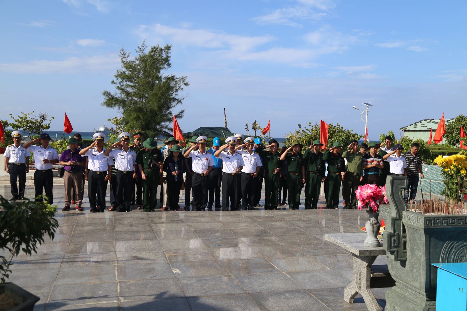 Các thành viên Đoàn công tác tuyến phía Bắc Trường Sa dành một phút mặc niệm Đại tướng Võ Nguyên Giáp tại Công viên mang tên Người trên đảo Sơn Ca.