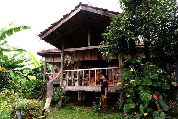 Anh A Nhưk đưa chúng tôi đến ngôi nhà sàn lâu năm nhất ở giữa làng để giới thiệu về nét độc đáo của nó. Đây là ngôi nhà của cha anh để lại cho cô em gái anh trước khi qua đời. Ngôi nhà nằm ẩn khuất giữa vườn cây um tùm, tạo một không gian yên bình và mát mẻ.