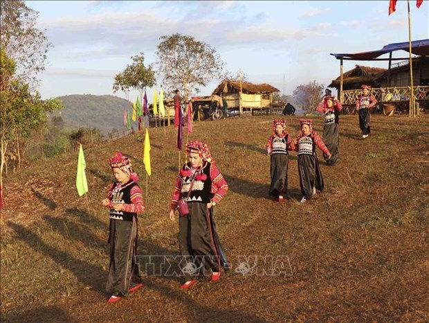 Thiếu nữ người Hà Nhì trong trang phục truyền thống khi đi chơi lễ trong dịp Tết cổ truyền Hồ Sự Chà. Ảnh: Xuân Tiến – TTXVN