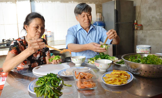 Vợ chồng ông Hoàng Văn Ngân, giới thiệu món Tôm cuốn Thùa Lâm.