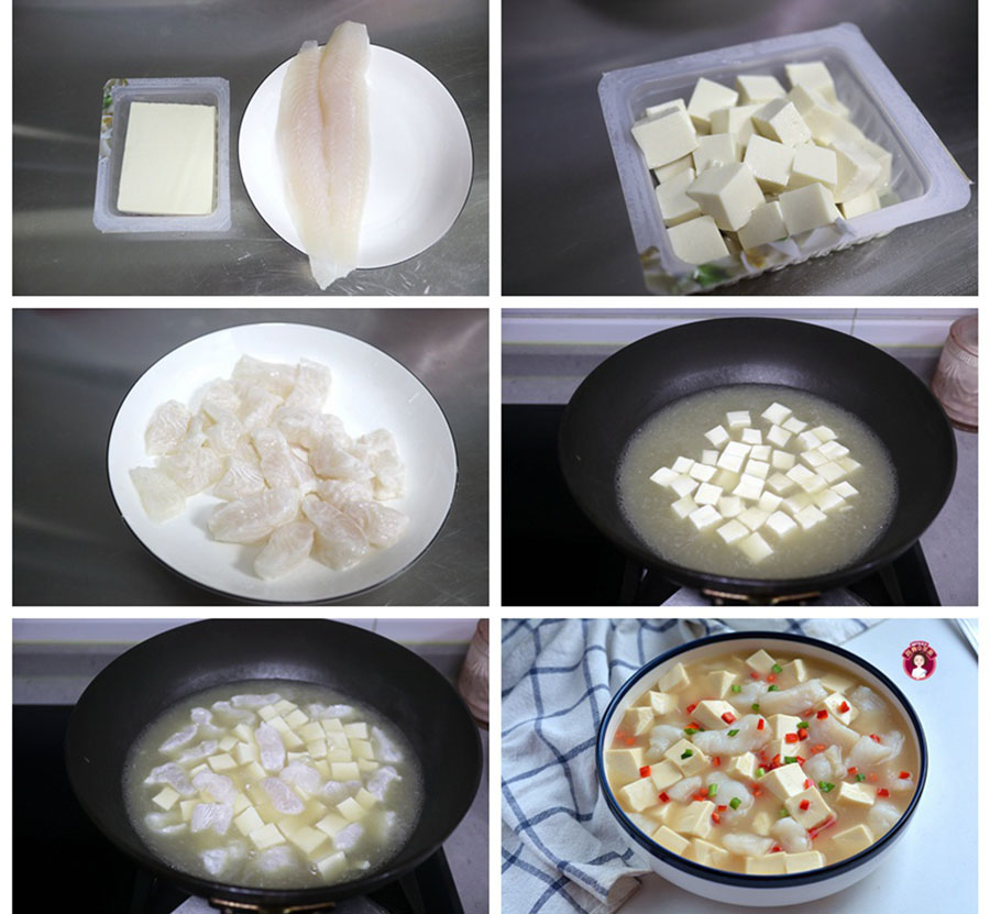 Nguyên liệu : 1 - 2 miếng đậu hũ mềm, 1 miếng cá basa phi lê, 30 gram canh sò huyết tươi, 1 nồi nước, 1 ít bột mỳ , 1 chút ớt đỏ.