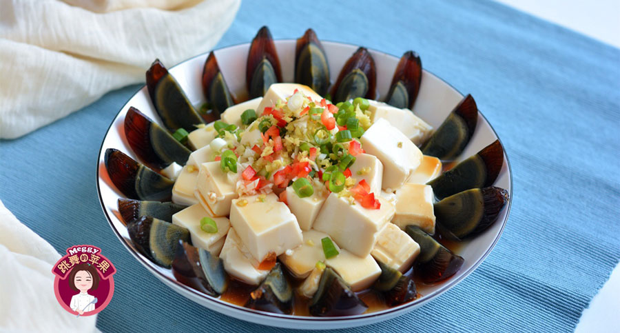 Nguyên liệu: 1 hộp đậu hũ tươi , 3 quả trứng bắc thảo, 1 củ hẹ, 1 nhánh tỏi, 1 củ gừng tươi, 1 quả ớt đỏ, một ít nước tương, giấm gạo.