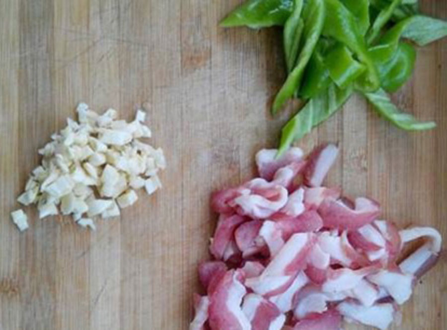 Bước 2: Rửa sạch ớt chuông xanh thẳng vòi nước sau khi rửa sạch cắt bỏ cuống ớt rồi tách bỏ hạt, cắt miếng vừa ăn như cà tím rồi để ráo nước. Thịt ba chỉ thái miếng nhỏ, tỏi giã nhỏ để sẵn.