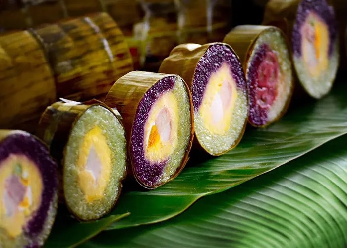 Bánh con sùng ngũ sắc (màu trắng tinh khôi của bột gạo; vàng ươm của gấc; tím sen hồng của lá cẩm; xanh ươm của lá dứa, xanh thẫm của lá mơ)