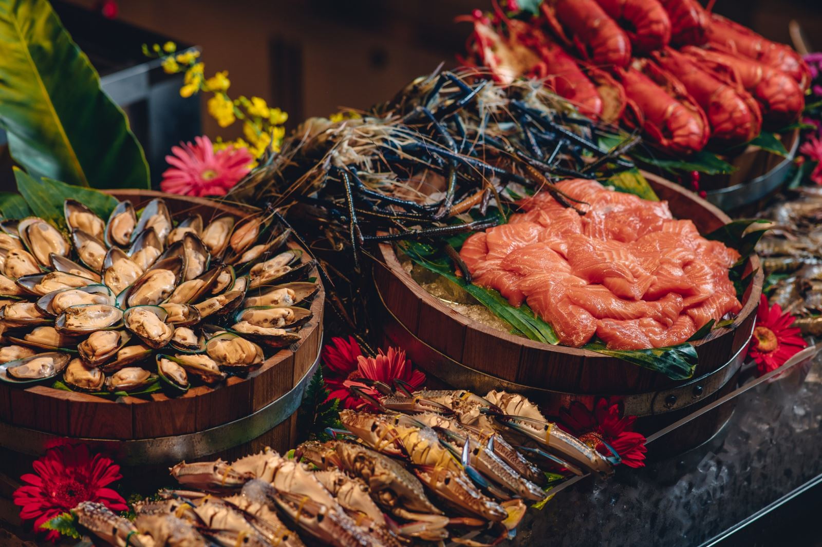 Nhâm nhi thức uống tuyển chọn và hòa mình vào các quầy ẩm thực sống động, với cá hồi muối gravadlax ngon mê mẩn cùng mùi thơm của thì là quyện trong từng thớ cá, thịt đùi cuộn xông khói, hàu sữa Pháp và vô vàn các loại tôm, ghẹ tươi sống, dẻ sườn bò Mỹ nướng, đùi lợn đút lò, cá tầm đút lò quyện sốt rau củ.
