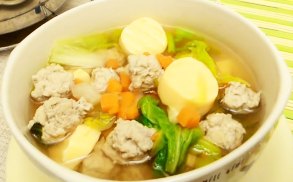 Thịt lợn ướp với muối và hạt tiêu, chia thành từng viên nhỏ cỡ đầu ngón tay cái. Đun sôi nước, cho tỏi đập dập và 1/2 thìa xì dầu vào, thả các viên thịt vào nồi đun chín. Sau đó cho cà rốt, rau cải thảo vào đun sôi. Múc ra bát và rắc cần tây lên trên.