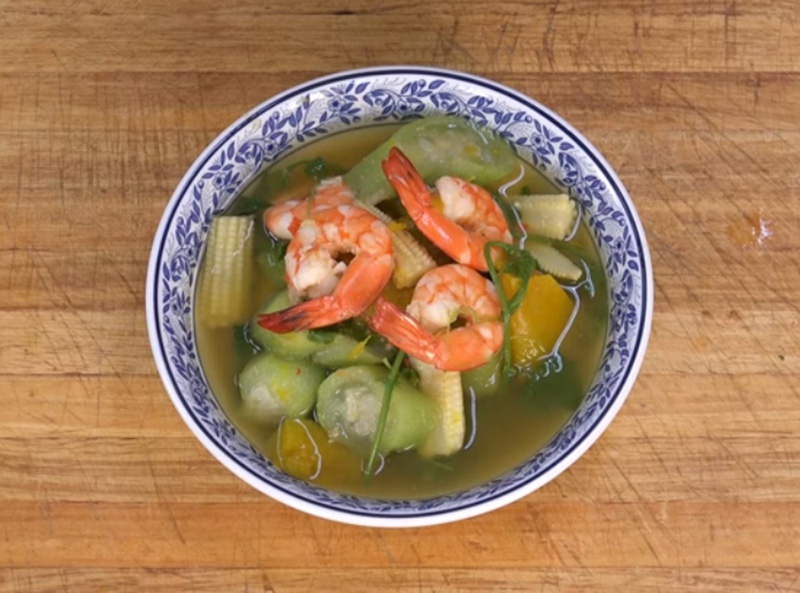 Giã nhuyễn các nguyên liệu: Tôm luộc, ớt, hành tím, mắm tôm với bột cà ri. Đun sôi nước dùng, cho hỗn hợp vừa giã nhuyễn vào khuấy đến khi tan rồi cho lần lượt bí đỏ, bí ngòi, bắp non và tôm tươi đun đến khi chín. Nêm nước mắm, húng quế vào rồi múc ra bát.