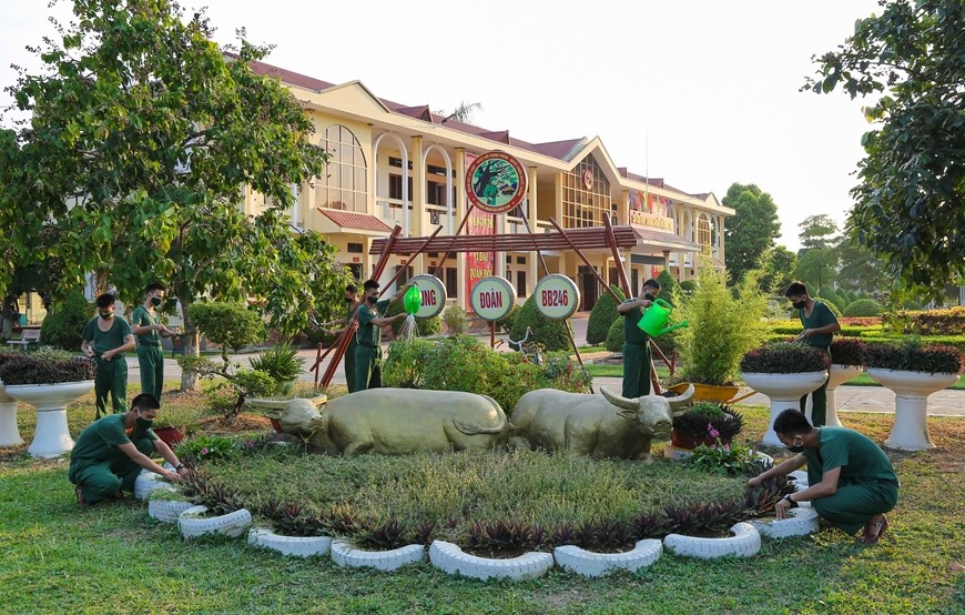 Đoàn viên, thanh niên Liên chi đoàn Tiểu đoàn 1, Đoàn cơ sở Trung đoàn 246 chăm sóc vườn hoa, cây cảnh tại khuôn viên văn hóa của đơn vị.
