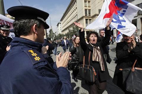 Tại thành phố Thessaloniki, miền Bắc Hy Lạp, nơi có 14.000 người tham gia biểu tình, xô xát cũng đã xảy ra khi người biểu tình ném trứng và hộp sữa chua đánh cắp ở siêu thị vào một tòa nhà chính phủ. Theo ghi nhận, có khoảng 30.000 người tại Hy Lạp đã xuống đường biểu tình trong ngày 11/3. Thậm chí trong đám người biểu tình có cả cảnh sát.