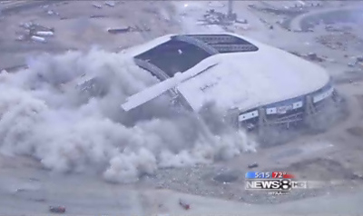Sân vận động Texas với sức chứa 65.675 người bị phá hủy trong một vụ nổ được kiểm soát lúc 7h03 sáng ngày 11/4. Công trình đã biến thành một đống đổ nát chỉ trong 35 giây nhờ sức công phá của 1 tấn thuốc nổ. Truyền hình địa phương đã phát hình ảnh trực tiếp về vụ nổ.