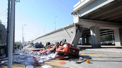 Rơi xuống từ độ cao 30m cùng khối bêtông này là bốn xe tải chở đầy hàng hóa, khiến 3 người chết tại chỗ, 5 người bị thương.