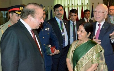 Ngoại trưởng Swaraj đã gặp Thủ tướng Pakistan Nawaz Sharif, một cuộc gặp mà báo India Express miêu tả là mang bầu không khí “nồng ấm và gần gũi".
