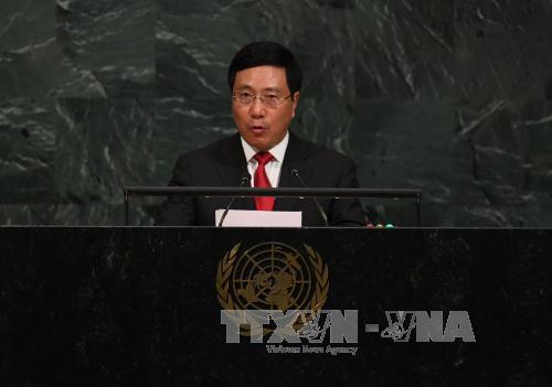 Phó Thủ tướng Phạm Bình Minh cũng nêu bật thành tựu và đóng góp của Việt Nam trong quá trình chủ động, tích cực hội nhập quốc tế, đặc biệt trong vai trò chủ nhà Diễn đàn Hợp tác kinh tế châu Á - Thái Bình Dương (APEC) 2017, thành viên Hội đồng Nhân quyền nhiệm kỳ 2014-2016, Hội đồng Kinh tế - Xã hội nhiệm kỳ 2016-2018 và hiện đang ứng cử làm uỷ viên không thường trực Hội đồng bảo an LHQ nhiệm kỳ 2020-2021, tích cực triển khai Nghị sự 2030 về phát triển bền vững, Thoả thuận Pa-ri về biến đổi khí hậu, tham gia các hoạt động gìn giữ hoà bình LHQ.