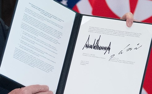 Ngày 12/6, Tổng thống Mỹ Donald Trump và Lãnh đạo Triều Tiên Kim Jong-un đã ký tuyên bố chung lịch sử tại Hội nghị Thượng đỉnh Mỹ-Triều ở Singapore.