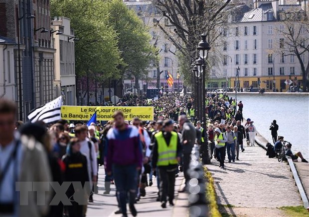Người biểu tình Áo vàng tập trung tại khu vực La Defense, phía tây Paris, Pháp, ngày 6/4. (Nguồn: AFP/TTXVN)Ngày 13/4, hàng chục nghìn người thuộc phe "Áo vàng" tại Pháp đã đổ xuống đường biểu tình vào cuối tuần thứ 22 liên tiếp để phản đối các biện pháp mà Tổng thống Emmanuel Macron dự định công bố vào tuần tới.