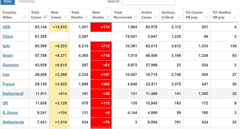 Tình hình dịch COVID-19 tại Mỹ ngày càng trở nên đáng quan ngại khi nước này ghi nhận thêm 14.933 ca mắc mới và thêm 174 ca tử vong. Như vậy tính đến thời điểm hiện tại, Mỹ đang là nước bị ảnh hưởng nghiêm trọng bởi dịch bệnh nghiêm trọng nhất thế giới, vượt cả Trung Quốc đại lục với tổng số 83.144 ca mắc COVID-19 , trong đó 1.201 ca tử vong.