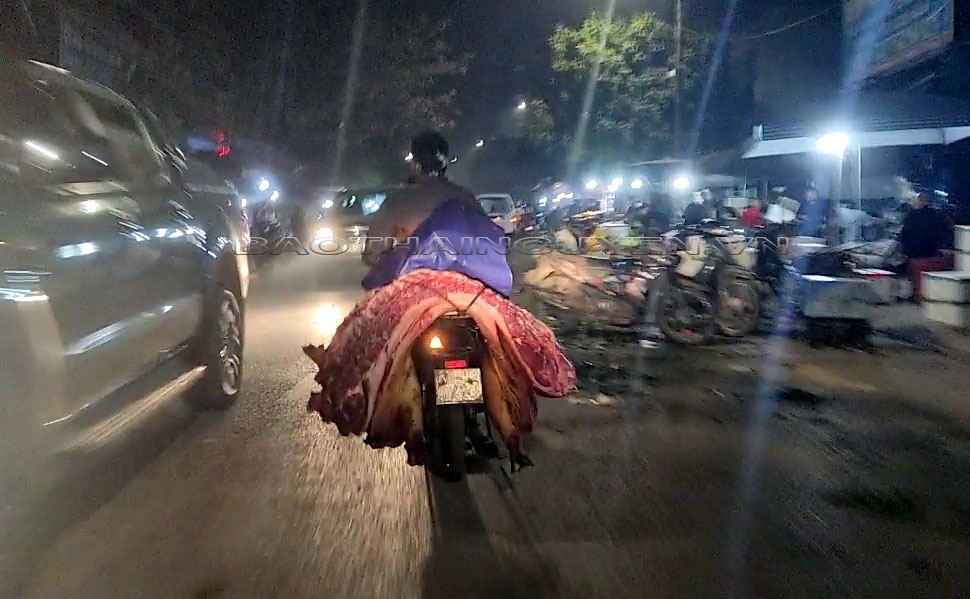 Thịt lợn từ cơ sở giết mổ không phép này được vận chuyển bằng xe máy đến chợ đầu mối Túc Duyên để tiêu thụ.