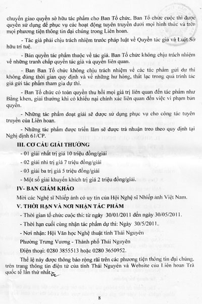 Thể lệ Cuộc thi sáng tác nghệ thuật về Liên hoan Trà Quốc tế lần thứ nhất - Thái Nguyên 2011