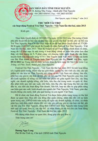 Để tổ chức các hoạt động Festival Trà được thêm phần trang trọng và thu hút được sự quan tâm, theo dõi của đông đảo quần chúng, nhân dân đối với sự kiện quan trọng này, UBND tỉnh trân trọng đề nghị các doanh nghiệp, tổ chức, cá nhân phát huy tinh thần trách nhiệm đối với việc gìn giữ các giá trị văn hoá vật thể, phi vật thể của Trà Thái Nguyên, đồng thời UBND tỉnh Thái Nguyên trân trọng kính mời quý cơ quan, đơn vị, các tập thể, cá nhân tham gia tài trợ cho các hoạt động Festival Trà Thái Nguyên - Việt Nam lần thứ hai, năm 2013.