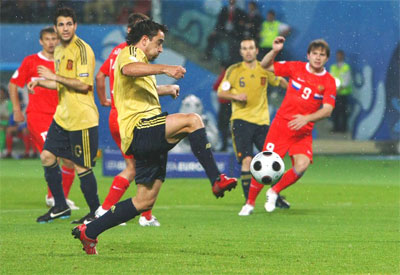 Qua giờ nghỉ giải lao, "đàn bò tót" đột ngột tăng tốc, khiến hàng thủ áo đỏ không kịp phản ứng. Phút 50, Iniesta xử lý tinh tế bên góc trái rồi tung ra đường chuyền thuận lợi để Xavi lẻn xuống thoải mái đệm bóng tung lưới Nga ở cự ly gần.