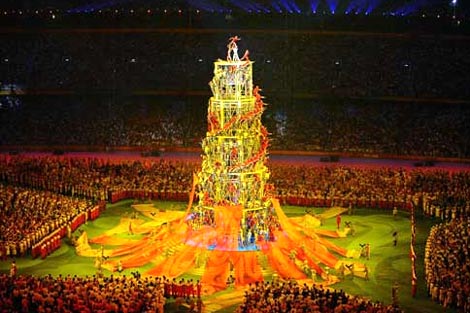 Pháo hoa rực sáng quanh sân vận động quốc gia hình tổ chim. Nhiều màn trình diễn giới thiệu về tính đa dạng và sắc màu trong cuộc sống hiện đại của người Trung Quốc, một phần quan trọng khác trong tối bế mạc là lễ trao cờ Olympic cho Anh, nước đăng cai kỳ Thế vận hội kế tiếp vào năm 2012.
