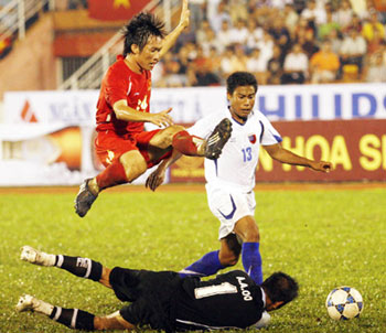 Sớm dính đòn phản công, nhưng Việt Nam vẫn làm chủ thế trận và tạo ra liên tiếp những cơ hội. Nhưng các chân sút của chúng ta đã thể hiện khả năng kết thúc quá tồi. Phút 29, Công Vinh chuyền như đặt cho tiền đạo Việt Thắng sút ra ngoài cầu môn từ cự ly chỉ chừng 11 mét. Một cơ hội tuyệt vời bị lãng phí. Phút 34, đội chủ nhà có thêm pha tấn công trực diện trung lộ rất hay. Công Vinh nhận quả chọc khe, nhưng từ gần chấm 11 mét đã sút chệch cột dọc tấc gang. Phút 39, Quang Thanh có đường chuyền bổng vừa tầm vào giữa khu cấm địa, nhưng Việt Thắng không thể dứt điểm ở vị trí tương đối tự do.