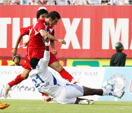Mọi đường lên bóng của đội khách đều qua chân Tấn Tài, nhưng cầu thủ này bị "quản" rất chặt chẽ bằng lối chơi đầy cơ bắp của hậu vệ Hải Phòng. Không ít lần Tấn Tài nổi quạu trên sân vì bị đá xấu.