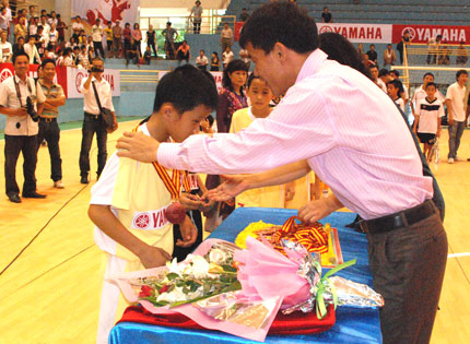 Ban Tổ chức trao giải Ba cho đội bóng đá nhi đồng Thái Nguyên