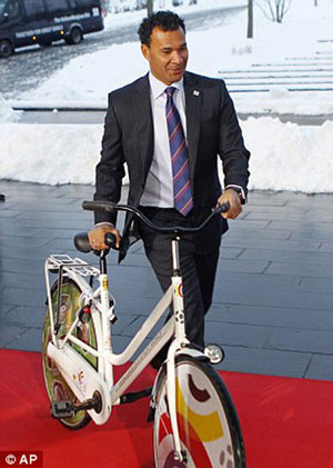 | Ruud Gullitt của đoàn Hà Lan đến dự lễ bằng... xe đạp. |