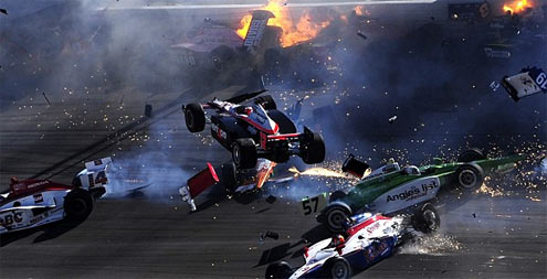 15 chiếc xe đua tốc độ cao đã va chạm với nhau trong chặng đua hôm qua, dẫn đến cái chết bi thảm của ngôi sao người Anh Dan Wheldon.