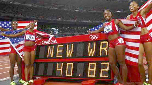 Tianna Madison, Allyson Felix, Bianca Knight và Carmelita Jeter đã kết thúc chặng đua với tổng số thời gian là 40 giây 82, đánh bại kỷ lục 41 giây 37 từng được đội chạy tiếp sức nữ của Đông Đức thiết lập vào năm 1985. Ở nội dung nói trên, một cường quốc về điền kinh khác là Jamacai về nhì với 41 giây 41. Đứng thứ 3 là Ukraina với thành tích 42 giây 04.