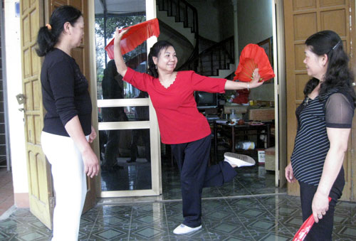 Bà Tươi kể: Trước đây, tôi bị bệnh thần kinh tọa, việc đi lại rất khó khăn, nhưng do chịu khó tập luyện, tôi không biết mình khỏi bệnh từ bao giờ. Còn bà Hồi kể: Gần 10 năm trước đây, cánh tay trái của tôi bị run, không nhấc được chiếc lược để chải tóc, sau đó tôi tham gia CLB, tích cực tập luyện các bài thể dục dưỡng sinh, rồi khỏi bệnh lúc nào không hay. Nói xong, bà Hồi phấn chấn cầm đôi quạt hồng “đi” cho tôi xem bài “Song quạt Mộc Lan” với các động tác: Gà vàng báo thức; Sáng xuân tháng 3; Khỉ lười ngắm trời; Ngân hà vạn dặm và Hình hạc trong hồ… uyển chuyển dẻo mềm như một diễn viên múa trên sân khấu.