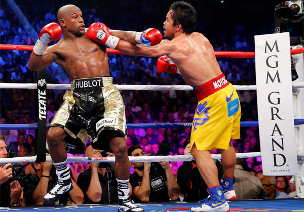 Mayweather nhập cuộc tốt hơn và chiếm thế chủ động ở những hiệp đầu. Phải tới hiệp thứ tư Pacquiao mới khiến những ai hâm mộ anh có dịp phấn khích, khi liên tục tung những cú móc tay trái vào đầu đối thủ. Nhưng sau đó võ sĩ Mỹ luôn dễ dàng phòng thủ thành công trước nỗ lực tấn công của Pacquiao. Tốc độ và sự linh hoạt của đôi chân giúp Mayweather tránh được không ít cú ra đòn mạnh.