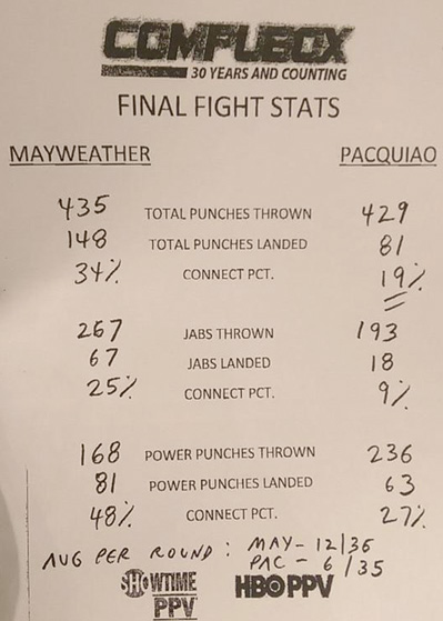 Pacquiao trận này chỉ có tổng cộng 81 cú đấm chính xác, ít nhất trong số các trận đánh đủ 12 hiệp của anh trong vòng bảy năm qua. Mayweather có tới 148 cú đấm chính xác, trong đó có tới 81 cú với lực mạnh.
