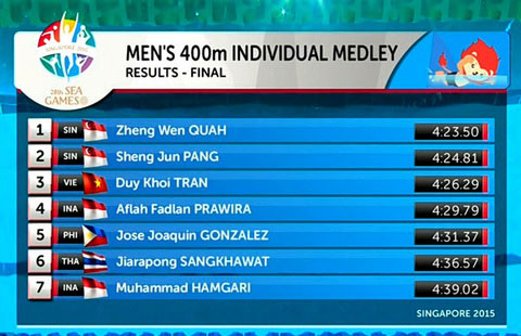 Trần Duy Khôi đã về vị trí thứ 3 nội dung bơi 400m cá nhân nam và nhận HCĐ với thành tích 4 phút 26 giây 29.