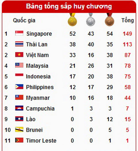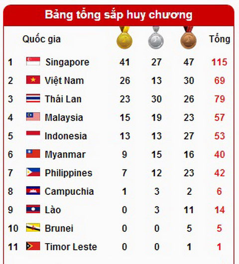 Tính đến 21h00 ngày 9/6, đoàn Thể thao Việt Nam tạm đứng thứ 3 trên bảng tổng sắp huy chương với 33 HCV, 16 HCB, 38 HCĐ. Dẫn đầu vẫn là chủ nhà Singapore với 52 HCV, 43 HCB, 54 HCĐ. T