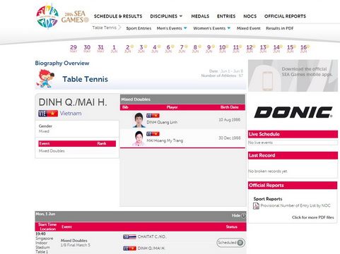 Sau đội tuyển U23 Việt Nam, hôm nay 1/6, đội tuyển bóng bàn Việt Nam cũng chính thức bước vào các cuộc tranh tài tại SEA Games 2015 ở các nội dung đơn nam có Lê Tiến Đạt, Trần Tuấn Quỳnh), đôi nam (Tuấn Quỳnh/Anh Tú, Quang Linh/Dương Văn Nam), đôi nữ (Mỹ Giang/Tường Giang, Vũ Thị Hà/Nguyễn Thị Nga), đôi nam nữ (Quang Linh/Mỹ Trang).