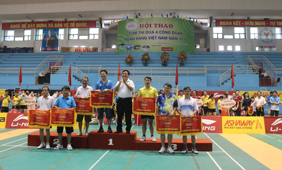 Kết thúc Hội thao, Đại diện NHNN Chi nhánh Thái Nguyên đã trao cờ luân lưu tổ chức Hội thao Cụm thi đua số 4 Công đoàn Ngân hàng Việt Nam năm 2016 cho NHNN Chi nhánh Bắc Kạn.