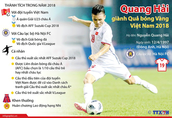Mới cùng đội tuyển bóng đá Việt Nam giành chức vô địch AFF Suzuki Cup 2018, tiền đạo Quang Hải đã xuất sắc giành danh hiệu Quả bóng Vàng Việt Nam năm 2018.