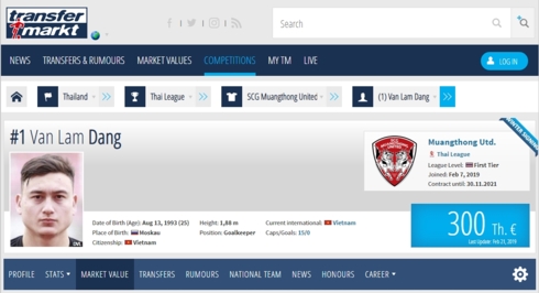 Cụ thể, Đặng Văn Lâm có giá trị chuyển nhượng 300.000 euro (khoảng 8 tỷ đồng). Thủ thành đang khoác áo Muangthong United là cầu thủ có giá trị chuyển nhượng cao nhất Việt Nam. Ở giải Thai League, Văn Lâm xếp hạng 64 và đứng thứ 9 ở Muangthong United.