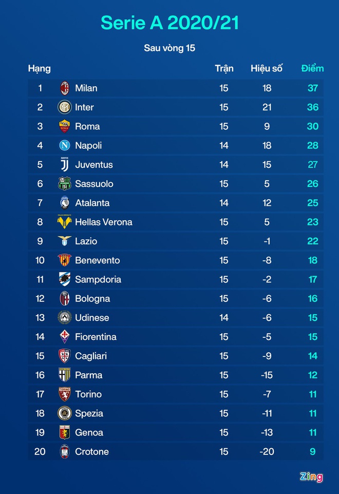 Hai bàn thắng của Ronaldo giúp Juventus đánh bại Udinese. Tuy nhiên, "Lão phu nhân" vẫn còn nhiều điều phải làm, khi họ đang kém Milan đến 10 điểm. Rossoneri đang bay cao ở đỉnh bảng xếp hạng với chuỗi 15 trận bất bại, gồm 11 chiến thắng.